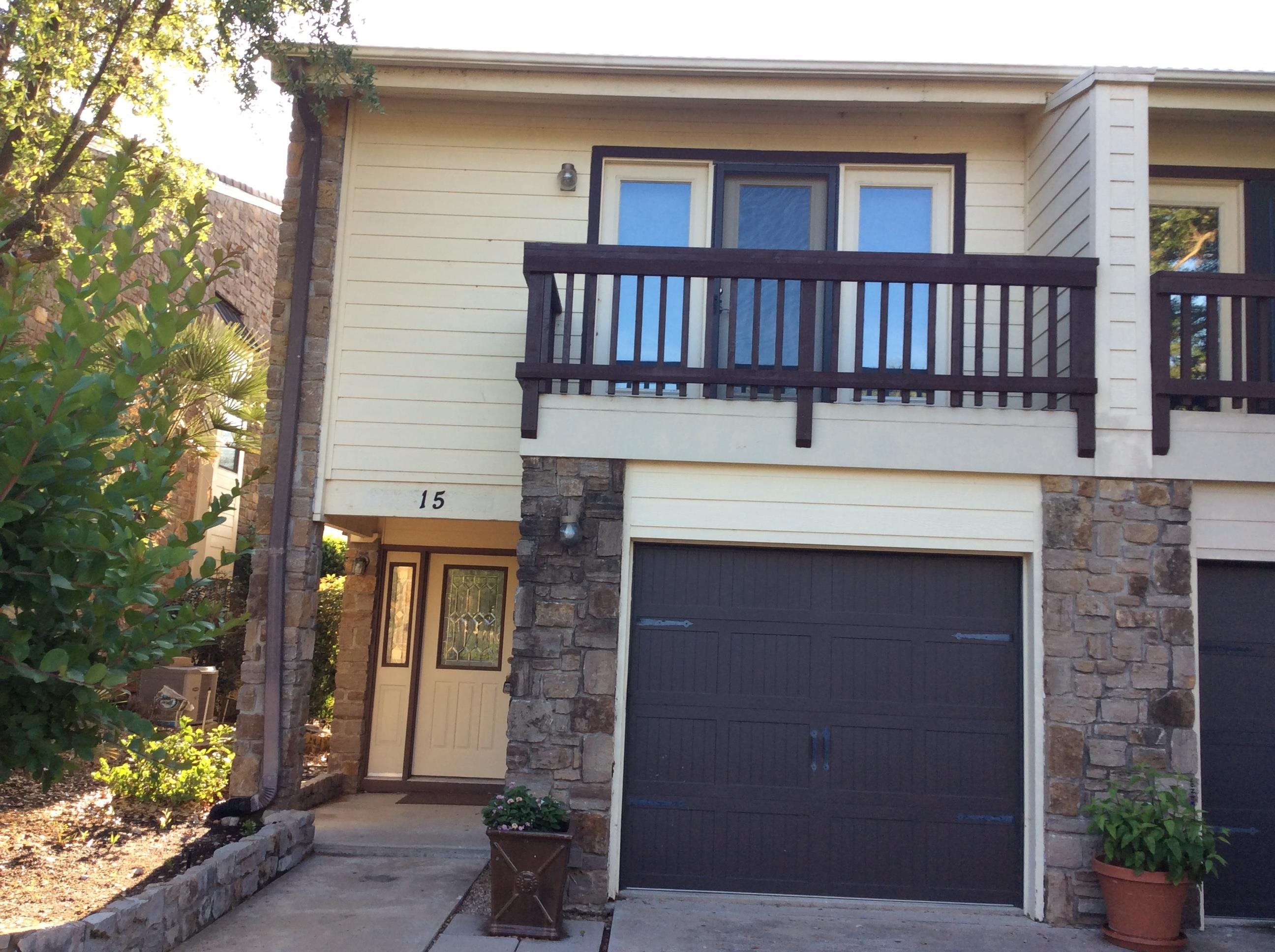Update golf course townhome on #18 of Slick Rock Golf Course. Open concept kitchen to living area with cozy rock fireplace. Generous bedrooms each with en suite baths. Primary bedroom boasts coffee bar/wet bar with private balcony overlooking the tee box and adjacent pond. Secondary bedroom is also generously sized with a balcony overlooking the front entry. The laundry area is in between both bedrooms with full sized washer & dryer. Downstairs has the updated 1/2 bath and sliding doors to the open patio. There are two additional storage closets and ample space in the attached garage. This TH boasts a relaxing atmosphere to enjoy life in the Hill Country and easy access to the resort amenities (membership required). Unit is unfurnished but shown with furnishings for placement ideas. Also for sale at $379,900. Owner is a LREA