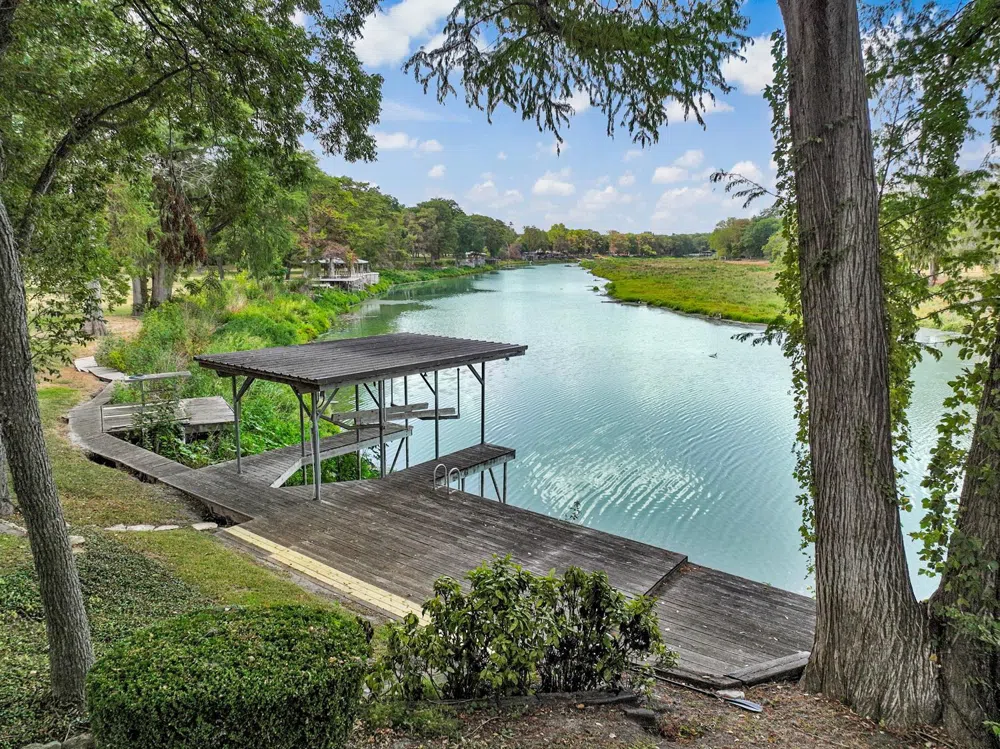 Waterfront Paradise tucked alongside the shores of Meadow Lake with over 600 ft of shoreline promising boundless aquatic delights. The boat lift and slip guarantees effortless water access, while a fish cleaning station caters to anglers. Even with reduced water levels, the Guadalupe River continues to flow through, inviting you to indulge in swimming, kayaking, and boating escapades. Positioned on 29 acres (with an optional 29 more), a meandering stone pathway guides you to the shoreline. The covered patio offers views of Meadow Lake and tranitiosn to a wooden deck and brick paver patio, creating an idyllic space for gatherings. Indoors the living room stands as the epicenter of the home with a beautiful fireplace that radiates warmth and offers breathtaking lake views. It connects to the covered patio, blurring the boundaries between indoor and outdoor living. The gourmet kitchen is a culinary masterpiece, outfitted with top-tier amenities, lustrous granite countertops, bar seating, and a substantial island. The dining room accommodates gatherings and seamlessly integrates with the living area. In the owner's suite you can bask in the soothing lake views. The en suite bathroom presents dual vanities, a sumptuous garden tub, and an artfully tiled walk-in shower. Additionally, the secondary bedrooms capture picturesque Meadow Lake vistas. This waterfront sanctuary is a rare fusion of country and lakeside living creating the ideal setting for endless days on Meadow Lake.