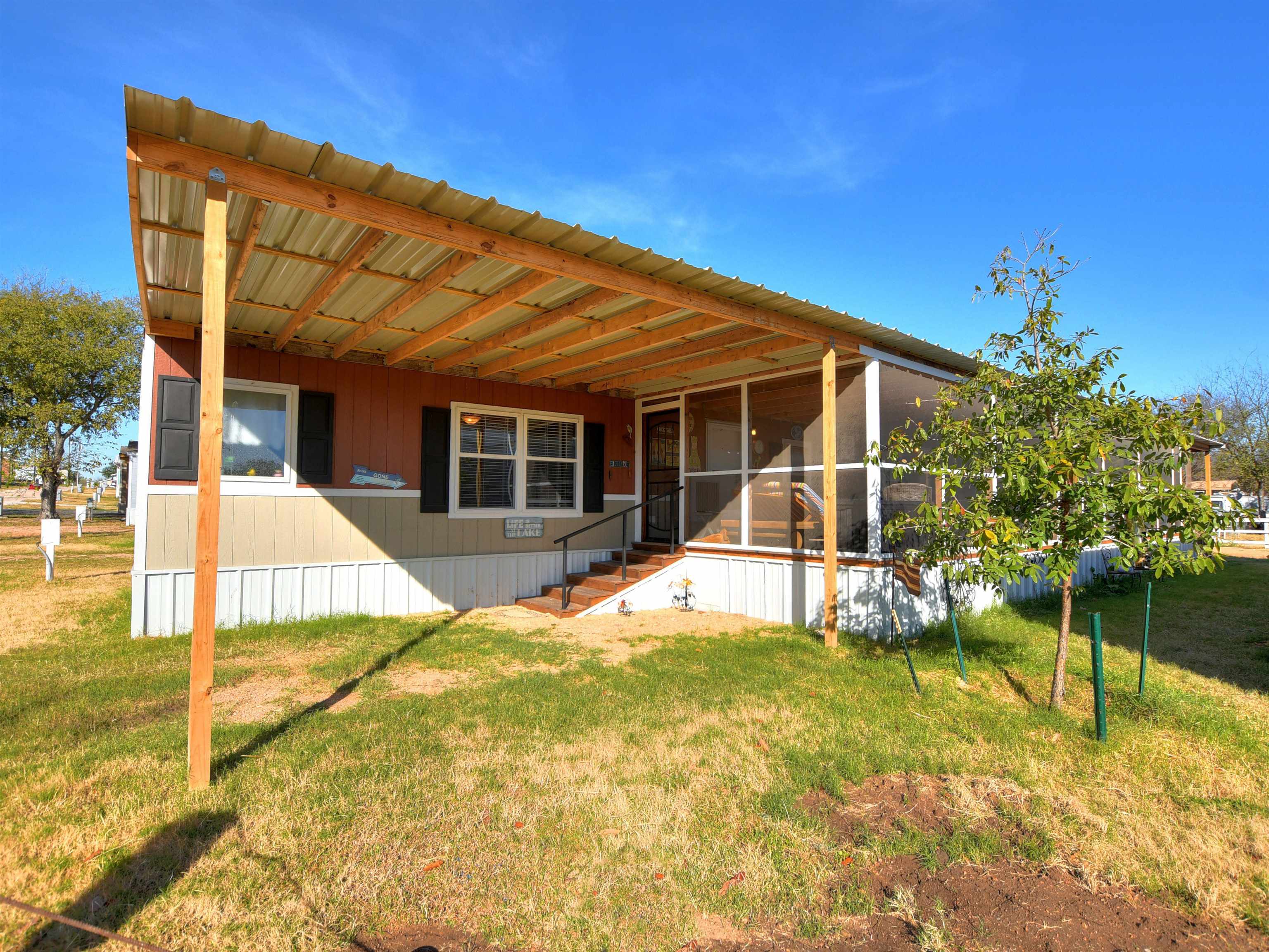 Wonderful 3 bedroom, 2-bathroom mobile home with a huge, covered porch nicely situated on a quiet lot in Lone Oak (55 and over) mobile home park. This home features a light, bright and open floorplan with tons of storage and is close and convenient to the lake, restaurants and shopping! Perfect permanent residence or weekend getaway! The covered patio is large enough for multiple families to enjoy the beautiful weather all year long! The kitchen features black appliances, electric oven and a separate microwave as well as a center island and is open to the large living room with a cozy fireplace. The spacious master suite has a walk-in closet, and a separate tub and shower. The walk-in laundry room has storage cabinets above the washer and dryer and a separate entrance. The secondary bedrooms are very spacious, and the closets are huge.
