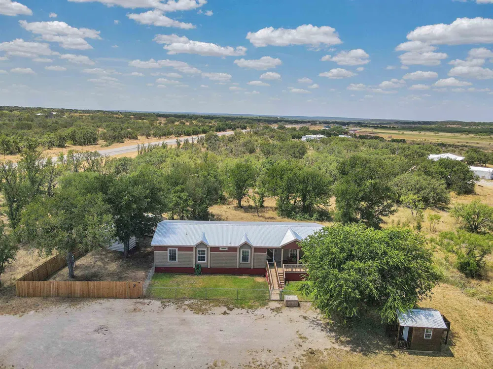 18.11+/- acres located south of Brownwood in Brookesmith on 377. The main house is beautifully set on a circle drive with privacy fencing as a barrier to main hwy. the yard is fenced in sections with 2 dog runs and vegetable garden. Outside the fence sits a playhouse and playscape. Main house is 3b/2b with covered deck on front. Walk in shower & soaker tub in Main bedroom and large open concept with kitchen & living room.Separate Dining Room. Laundry Room has dog door leading to back dog run. The guest house is 1000 sq ft, 2 bedroom/1bath, with cedar walls, corrugated tin ceilings, open concept large kitchen. Covered Carport is 40 x 40, with 30, 50 AMP RV hookups and 220V outlets & able to park many vehicles and RV. Workshop is 20 x 12 insulated with AC and storage building. Perimeter Fencing with Gate at entrance. Oaks & Mesquites at front and back, middle section with scattered mesquite shrubs and open field. Roof on the house- Class 4 metal 30 year put on in April. Metal storage building to the right of the carport will be retained by the seller.