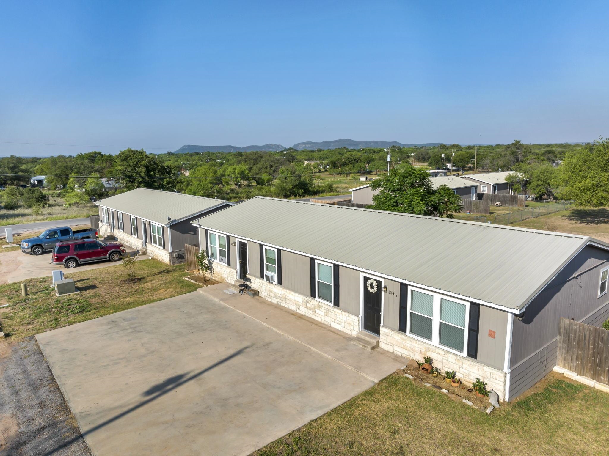 Aster Street Duplexes are a fantastic multi-family property located in the Llano County Opportunity Zone, in the ever-growing unincorporated town of Kingsland. This property consists of 11 modular constructed duplexes, with 22 individual units that remain 100% occupied. Each unit has 2 bedrooms, 2 bathrooms. All units have either ceramic tile floors or luxury vinyl plank, that greatly reduce turnover cost. Also included in each unit are washer/dryer hookups, electric range, refrigerator, dishwasher, and are individually metered through Kingsland water. Two car parking is available in front of each unit and the rear yards are completely fenced with partial cedar and perimeter chain link. This is attractive for tenants that are pet owners. Additional development opportunity exists with the +/- 3 acres of unimproved land within the same tract. Llano County, and especially, the unincorporated city of Kingsland offer an expedient approval process for potential development, since only county approval is necessary for permits. Many of the units have received significant upgrades that include LED lighting, range hoods/vents, interior doors and hardware (including closets), tankless water heaters, flooring, and interior paint. These upgrades offer residents a cost saving and energy efficient arrangement. The exterior renovation was completed in the summer of 2022, and included the addition of new window shutters, new paint, caulking, and more. See associated docs for more information on this property.