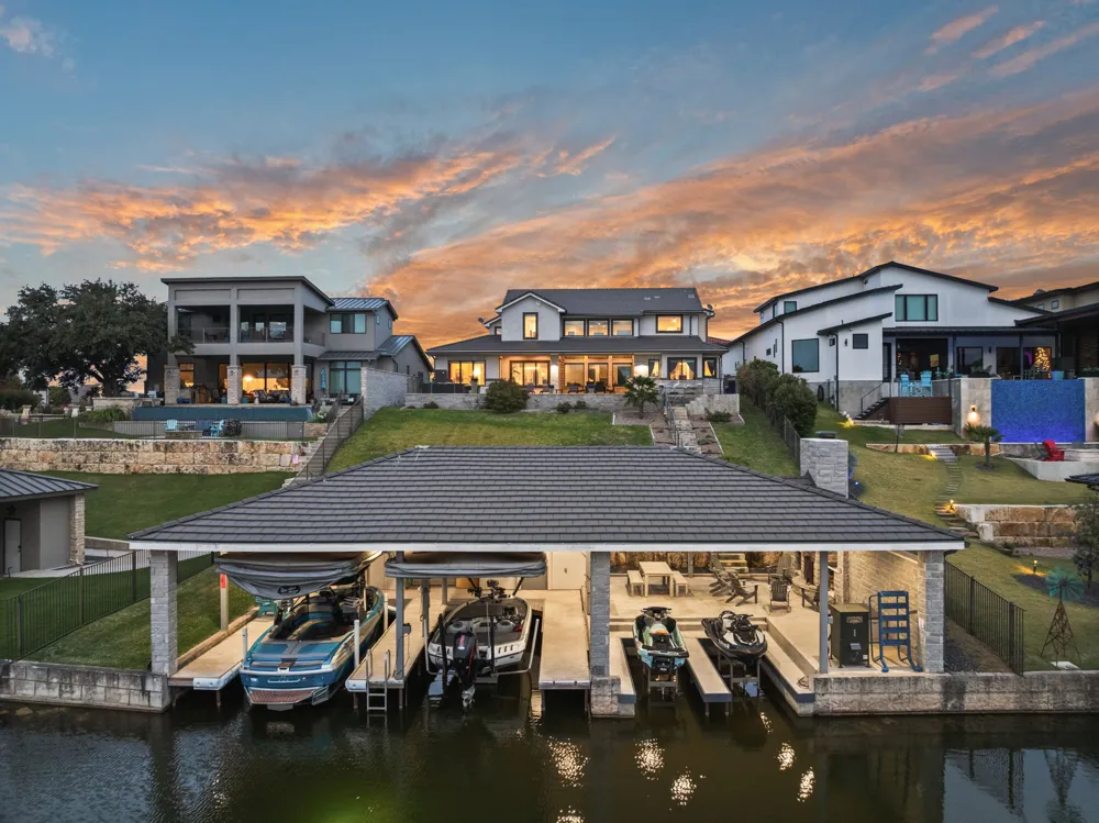 Stunning Turn-Key Luxury Waterfront Home in a Gated Community on Lake LBJ Fully furnished and ready to enjoy, this luxury lakefront retreat offers 6 bedrooms, 5.5 bathrooms, approx. 4,410 sq ft, a resort-style pool and spa, and an upgraded private boat dock. Designed for large groups and effortless entertaining, the home sleeps more than 24 guests with 16 total beds thoughtfully arranged throughout. The main level features an open floorplan with abundant natural light, a spacious dining area that flows into the kitchen and living room, and a kitchen with two large pantries, double ovens, and generous workspace. The primary suite includes a built-in work area, and two additional guest suites offer ensuite baths. Modern finishes and lake-inspired decor create an elevated and inviting setting. Upstairs offers an extra-large king room with built-in bunkbeds and a Jack and Jill bathroom with double vanities shared with a queen bedroom. An oversized bunk room with four bunks sleeps eight and connects by Jack and Jill bath to a spacious game room featuring a queen pull-out couch and a pool table, allowing the game room to serve as an additional bedroom if desired. Outdoor living includes a sparkling pool and spa, generous covered patios, and a highly upgraded private boat dock with a comfortable lounge area and fireplace, double JetSki lifts, and two boat slips with all-aluminum lifts and remotes. The home and the dock are equipped with an automatic bug control system for added comfort. Located in a calm, protected cove, the setting is ideal for paddleboarding, kayaking, floating, and effortless docking. A rare opportunity to own a fully furnished, turn-key luxury waterfront property in one of Lake LBJ’s most desirable gated communities. Buyer to independently verify all information.