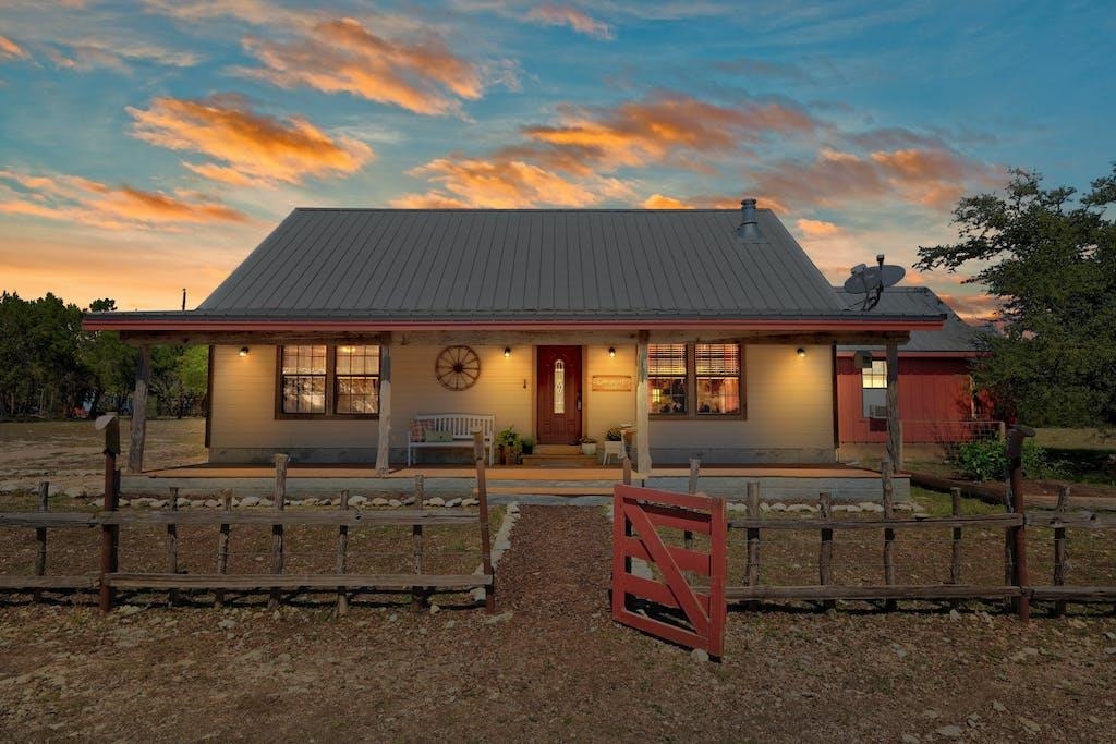 Ask about buydown incentive program! This quaint and private, 4 Bed, 2 Bath, two story home sits on 15 Acres in the Texas hill country. With high beamed ceilings, two covered porches, and wide open spaces, feels like vacationing in a charming bed and breakfast. Walk into the open floor plan with a free standing fireplace, breakfast area, country kitchen and stained concrete floors. The primary bedroom is to the left of the home with custom his and her wooden closet doors. Across the hall is the primary farmhouse style bathroom with a recently updated standing shower. On the right, three guest rooms with their own free standing electric heating fireplace unit to help unwind and relax from the day. The fully fenced/cross fenced 15 acres is perfect for animals, go carting and more. Ag Exempt and LOW TAX RATE of 1.5663!! If you are looking for the full Texas experience within 18 minutes to Lake Buchanon, 20 minutes to Marble Falls for shopping, the iconic Bluebonnet Café, and 20 minutes from Liberty Hill, this is it! Hurry!