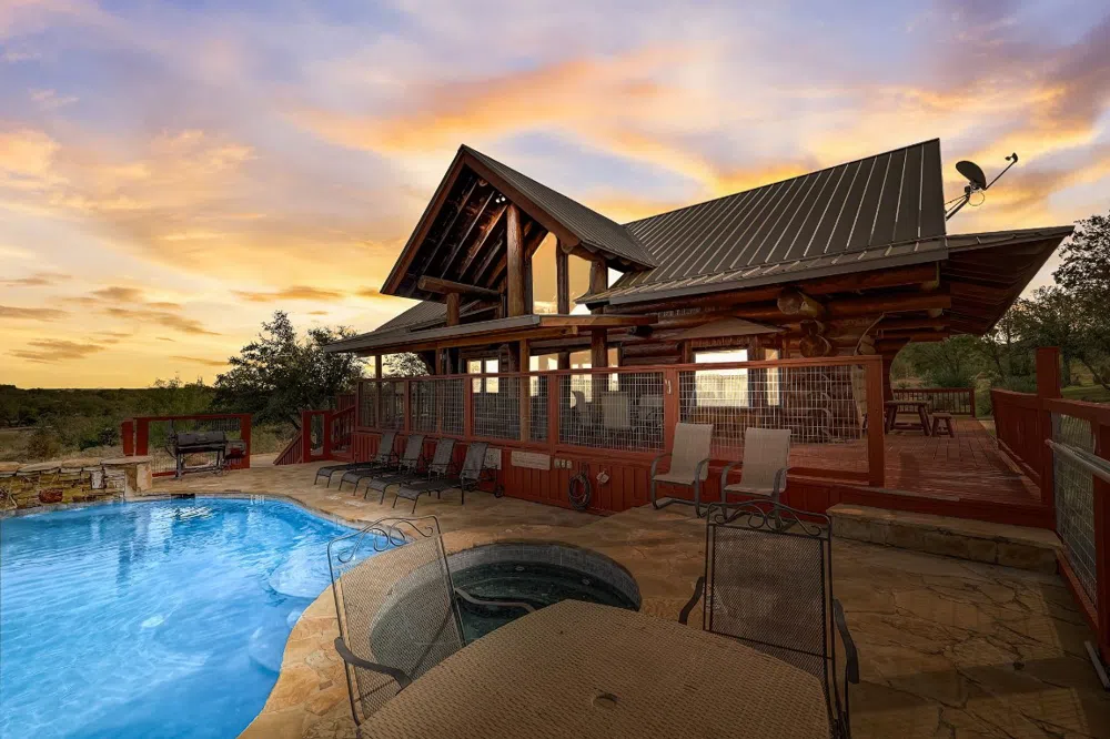 Welcome to your dream log cabin home located in the heart of Hill Country, Texas on 5 acres! This property is a stunning retreat that boasts breathtaking panoramic views of the surrounding natural beauty, and it is currently available for purchase as well as for rent with the Log Country Cove Management Company. As you approach the property, you will immediately notice the rustic charm of the log cabin exterior. The cozy cabin is set against a backdrop of lush greenery, and the beauty of the natural surroundings is immediately apparent. Inside, the cabin features an open-concept floor plan that is perfect for entertaining or spending time with family and friends. The living area is spacious and features a beautiful electric fireplace with the feel and sounds of a real fire that is perfect for warming up on chilly evenings. The kitchen is a chef's delight with its stainless-steel appliances, ample counter space, and plenty of room for meal preparation and storage. The cabin has three bedrooms and two and a half bathrooms with an upstairs loft area, providing ample space for you and your guests to relax and unwind. Each of the bedrooms is cozy and comfortable, with plenty of natural light and stunning views of the surrounding landscape. But perhaps the best feature of this property is the amazing outside space. The cabin features a heated pool and hot tub, perfect for relaxing and taking in the beautiful views. The outside space is also ideal for outdoor dining, grilling, and enjoying the fresh air and natural surroundings. This log cabin is truly a one-of-a-kind property that is perfect for anyone who loves nature and the great outdoors while also wanting to enjoy a income producing property. With its stunning views, cozy interior, and amazing outside space, it's no wonder that this property is a popular rental. Come and experience the magic of Hill Country in this beautiful log cabin home!