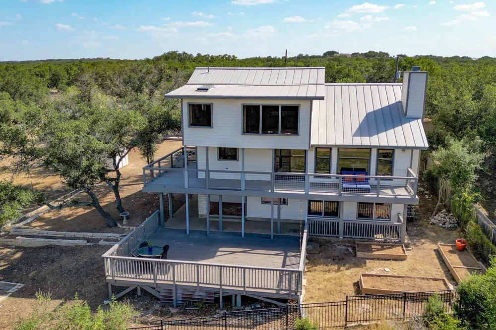 Panoramic Hill Country views from this multi-level Pedernales River home! The upper levels of the home include three bedrooms and two bathrooms with vaulted ceilings, large windows, and deck access all in the living room. The oversized master bedroom boasts the best view in the house perhaps rivaled by the picture windows next to the soaker tub in the bathroom! With private access to the lower level of the house, the additional living room, flex space, bathroom, and kitchen is perfect for a mother-in-law's suite, mancave, or game room! The large deck and terraced gravel patio under the shade of large oaks provides plenty of space for entertaining. Adjacent to the house is a detached carport and storage garage with covered parking for three vehicles. Gated stairs descend to the riverbed below. Wildlife abounds! Birds flying through the canyon and deer playing the riverbed; you're sure to enjoy the natural setting while still appreciating the conveniences of town nearby. Located in the desirable Lake Travis ISD with bonds approved in 2022 for two new elementary schools and a second high school, this location is perfect for families!