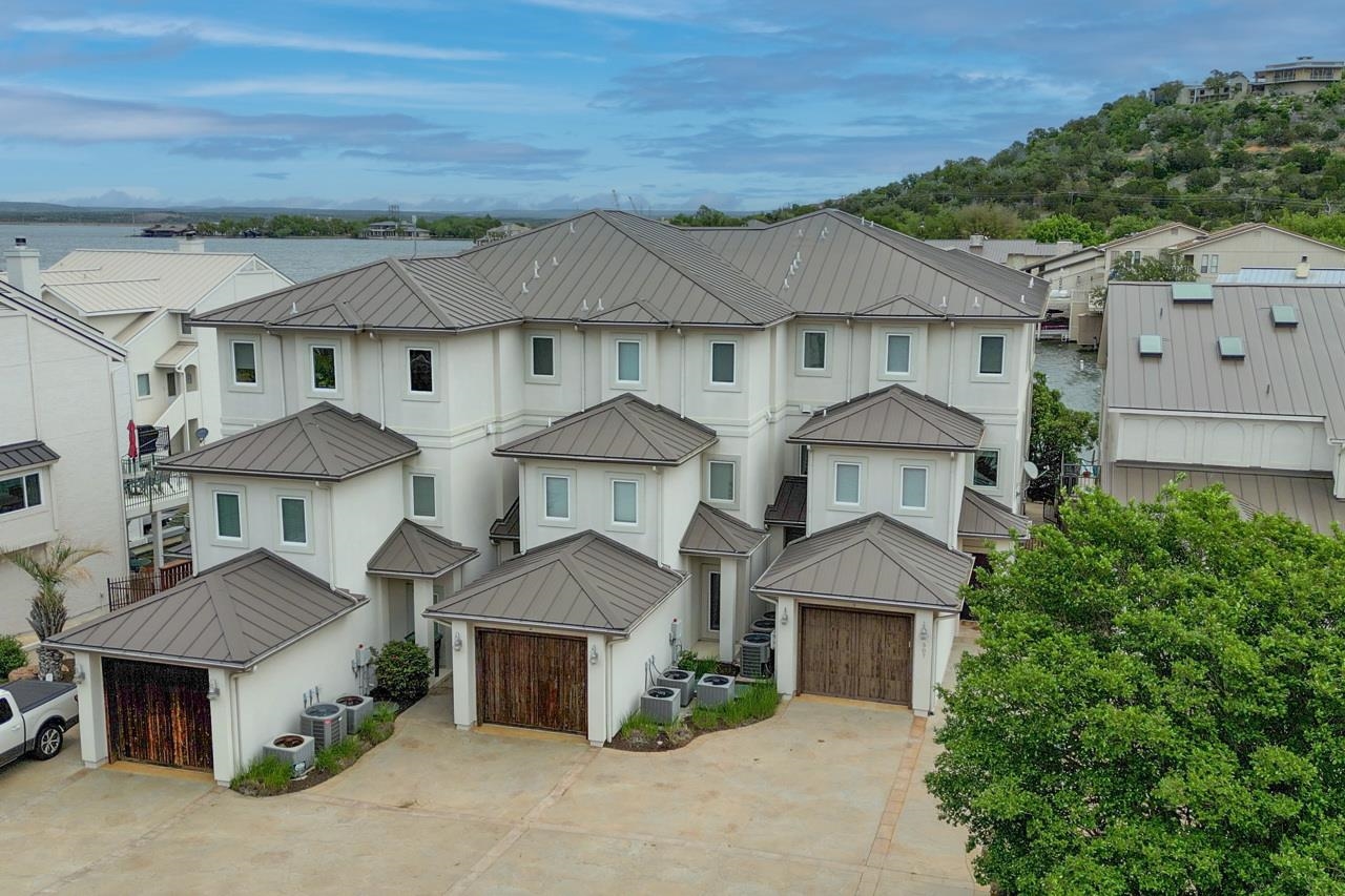 You will LOVE this spacious waterfront Townhome on a very desirable street in Horseshoe Bay. The front entry 1 car attached garage welcomes you as you approach, and then enter the first level featuring 2 bedrooms and 2 baths, with a cozy media room and lakeside deck - #1. On the second level you will find 2 more bedrooms and baths with again, a lakeside covered deck #2. The top level is for living and gathering with a chef's kitchen and open floor plan leading to a dining and living area. You will find the top level lakeside deck boasting stunning east facing lake views to catch breathtaking sunrises. Don't like stairs? No problem, take your private elevator between levels.The entire interior of the home has been recently painted. This end unit has the benefit of many windows that the interior unit does not offer, which allows for so much more light to enter this beautiful space. Lakeside you will find a heated pool, hot tub, covered electric boat lift, and 2 sea doo ramps for your water toys Feel immersed in the lake action as you enjoy the deck over the boat lifts. This exceptional complex has only 3 units total, and no short term rentals are allowed, so you will avoid loud party goers who rent for the weekend. All this being just moments away from the HSB Resort amenities, membership is required to use the resort and all it has to offer guests and private members. Did not flood in 2018. LIFE IS TOO SHORT, BUY THE LAKEHOUSE!!!!!