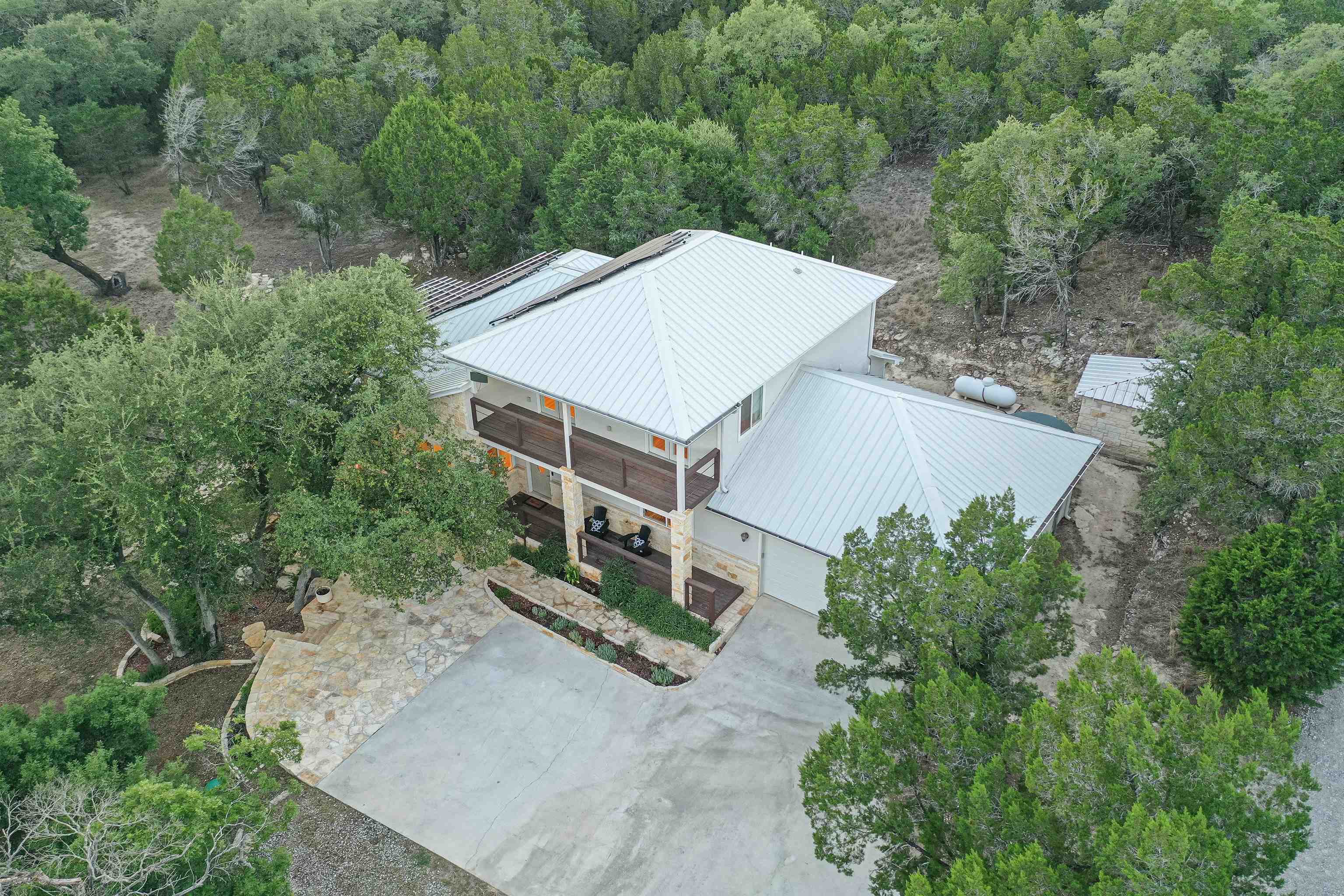 Hill Country views, and a wooden deck to park the lounge chairs! A perfect example of this craftsman home's architectural allure, this delightful 3-bedroom, 3-bathroom charmer is a notable opportunity within the highly desirable Spicewood area. The upstairs area can be transformed into a second office/study and a 4th bedroom. Let's not forget about the solar panels that line a part of the roof! The home is just a short drive to the Hill Country Galleria and several desirable restaurants and entertainment opportunities. A Pleasant commute to centers of employment means more time to enjoy the impressive view of the Hill Country. Exteriors include a good-as-new wooden deck right outside the kitchen area, a patio, a breezy front porch, and stone fire pit that sits down below in an open area away from the home, another excellent outdoor entertaining area. Delectable notions become tasty realities in the roomy, stylish kitchen, with natural light, attractive island layout, and stainless steel counters. A walk in pantry makes for easy storage and accessibility. The calm main-floor master bedroom includes a walk-in closet and private bath with step-in tiled shower. The other two bedrooms situated on the main floor for maximum convenience, are unique and designed with plenty of wardrobe storage. Attached two-car garage that is spacious enough to be partly converted to a workshop. This home is a blank canvas for your lifestyle and memories! Come check this beauty out, and get excited for exceptional living.