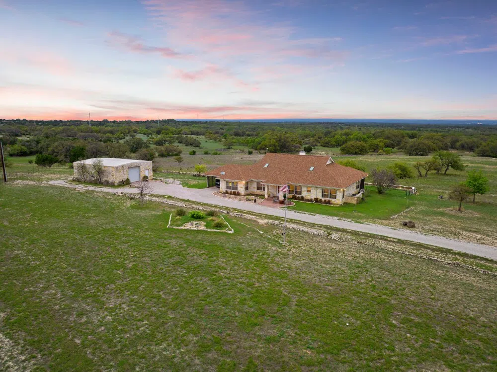 Gorgeous 2,857 sqft home on 7.23 acres with incredible views of the Texas Hill Country. This home offers convenient, single-story living with 3 beds, 2.5 baths, an office, formal dining, a breakfast nook, and a 30x40 ft detached workshop with 9 ft roll up door, as well as additional covered parking attached to the house. The primary suite boast beautiful views from a private screened in porch, as well as a large walk in closet with custom built ins galore. Enjoy a piece of country living in an equestrian friendly, gated-community that offers an abundance of privacy. Conveniently located 15 minutes from Johnson City wineries and 15 minutes from historic, Marble Falls. Being just outside the 281/71 growth corridor, makes this the perfect time to buy this property, as convenient shopping develops nearby.