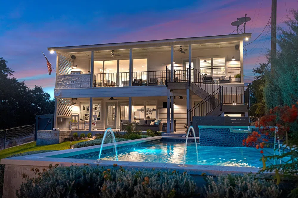 Fantastic Lake LBJ Waterfront that went under a complete renovation in 2022. This home is an entertainer’s paradise with over 80' of dock along the water that showcases a pergola and trex decking. A jet ski lift, boathouse with tackle room, and boat lift can house all your water toys. To complete this outdoor paradise is a soaking pool, spa, and outdoor surround speakers. The farmhouse inspired home features white oak wood floors, ship lap walls, quartz counters, plantation shutters, surround sound speakers, designer wallpapers, and custom lighting throughout. This re designed reverse level floor plan showcases an open family, dining, and kitchen area perfect for entertaining all your lake guest! A cook’s delight kitchen with built in appliances, double ovens, 36" built Monogram refrigerator and a huge center island is the perfect spot for your chef enthusiast. Adjacent to the kitchen is a huge laundry room with built in cabinets and mud bench. A stylish powder room sits just off the staircase entrance. Master suite has a vestibule entrance and spacious bed area with a private entrance out onto the balcony. Master bath has his and her vanities, make up area, 2 large closets, and a walk-in shower with built in freestanding tub. Downstairs there is a second living area that would make a great game area or tv den with a separate flex space that would make a cool bunk room. To complete any guest accommodations there are two large bedrooms with a shared bathroom downstairs too.
