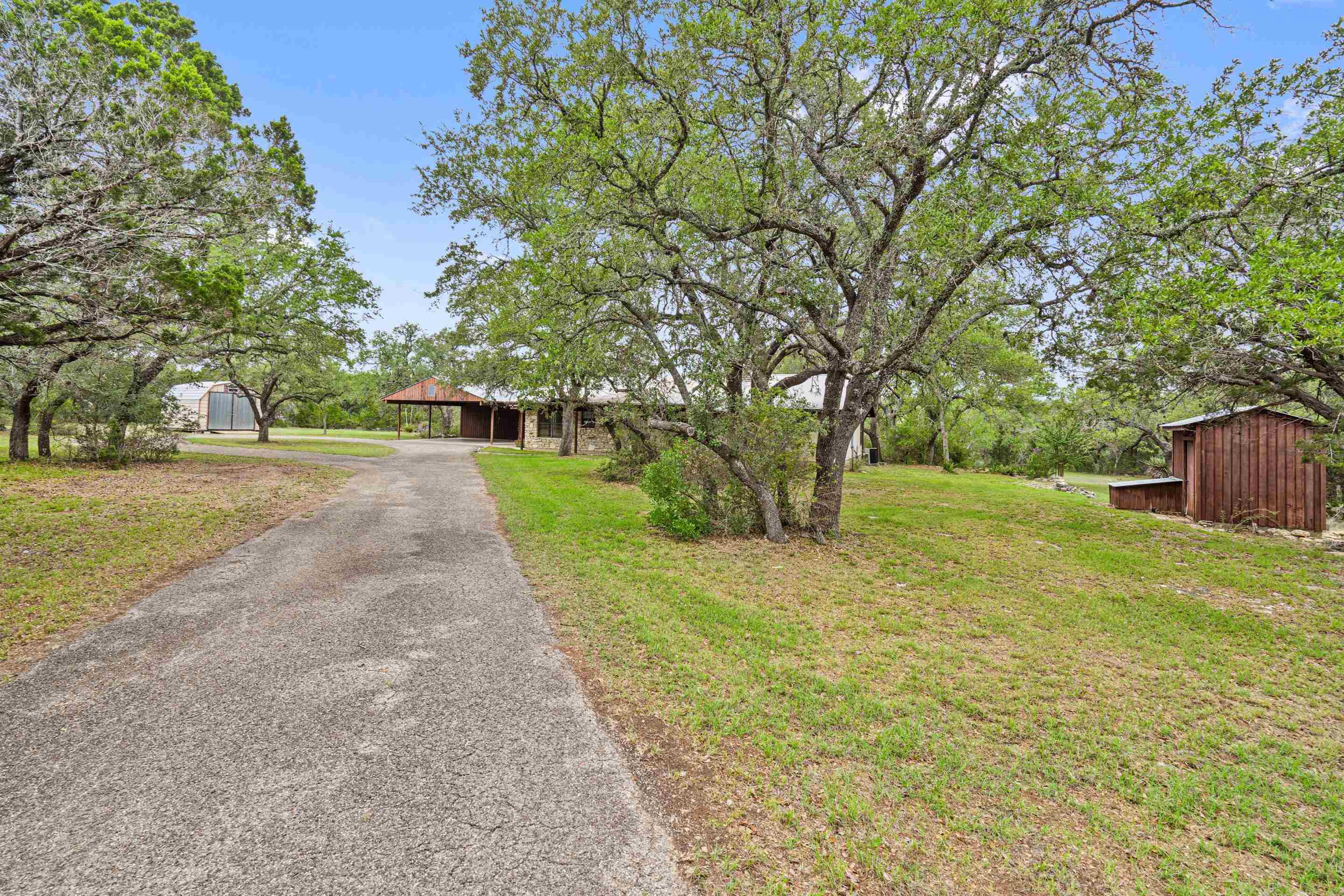 Endless opportunities nestled on 4.5 acres between Johnson City and Dripping Springs. Enjoy the peaceful surroundings and country setting while sitting on your porch or in the sunroom observing wildlife or along the peaceful wet-weather creek after a rain shower. Moderate tree cover on the perimeter of this property for ultimate privacy. Approximately 300 ft of road frontage on RR 3232. Rock home is a 3/2 totaling 1,749 sqft. Original 1,100 sqft was built in 1984 and an addition of 649 sqft was built in 2005. 2 car carport with attached 228 sqft workshop with a/c and built-in industrial vacuum system to convey. 264 sqft shed which has electricity and lights connected. Paved circular driveway. No HOA. Property like this is hard to find. Numerous opportunities and fantastic location!